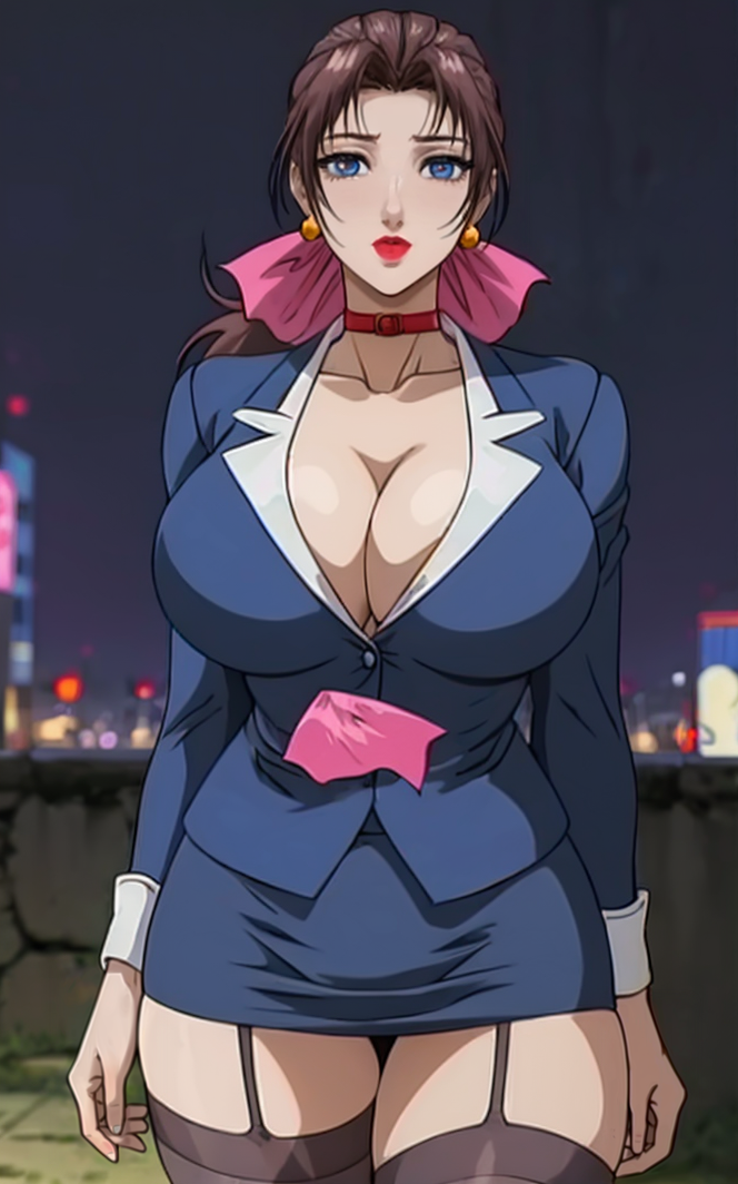 1girl, brown hair, blue eyes, long hair, earrings, red collar, lipstick, makeup, mature female, large breasts, red lips, pink bow, hair bow, hair ribbon, ponytail, collarbone,