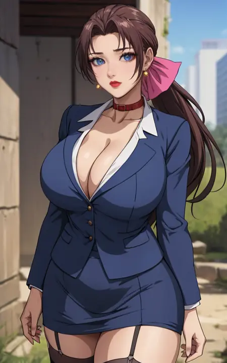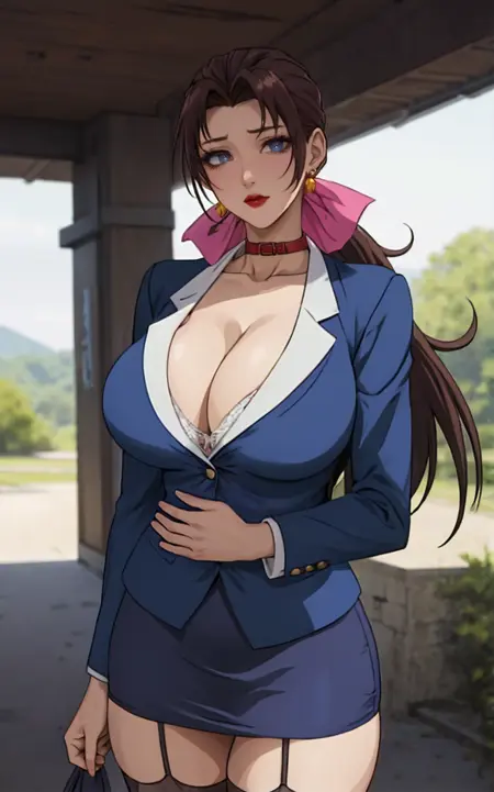 black skirt, cleavage, pink shirt, red choker, pencil skirt, collarbone, pantylines,