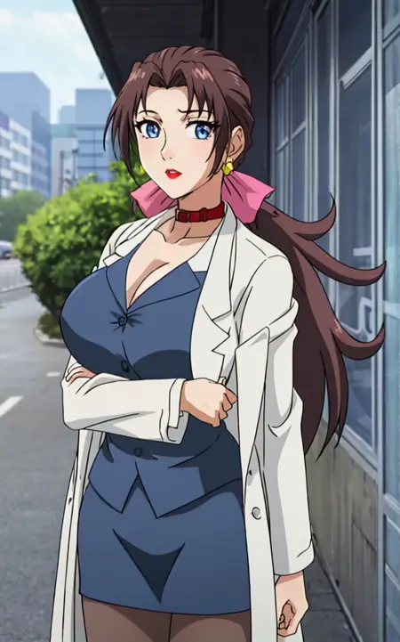 cleavage, labcoat, pencil skirt, pantyhose, sleeves rolled up,
