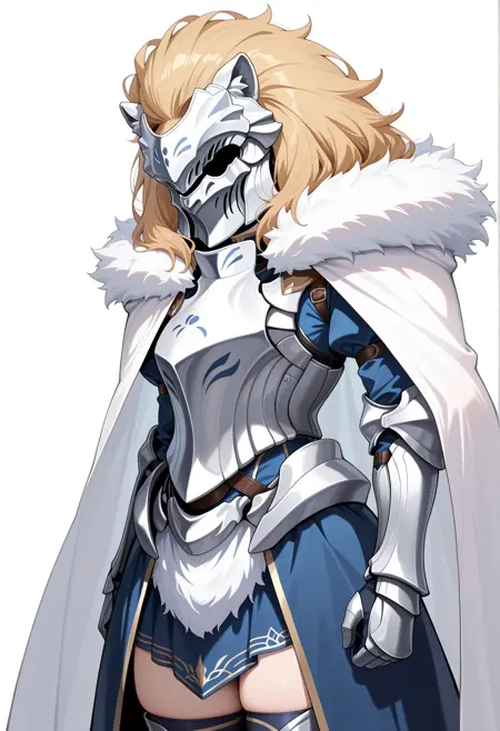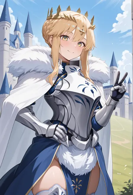 long hair, blonde hair, yellow eyes, sidelocks, single hair bun, french braid, crown, blue dress, armor, plate armor, gauntlets, greaves, thighhighs, white cape, fur-trimmed cape