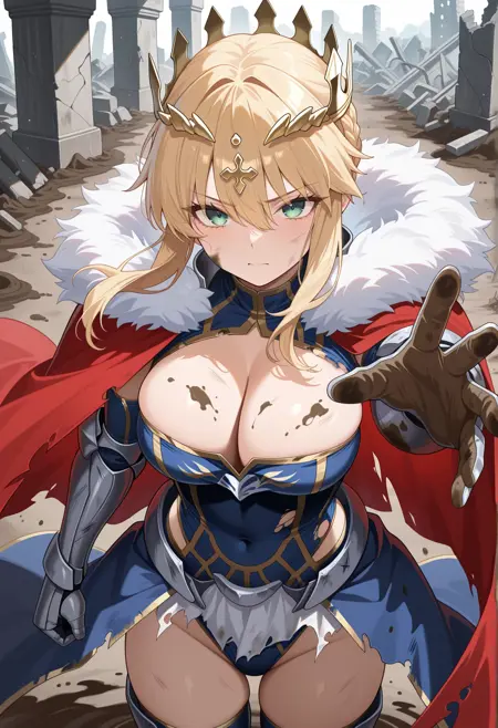 long hair, blonde hair, green eyes, sidelocks, single hair bun, french braid, crown, leotard, armor, cleavage, thighhighs, elbow gloves, gauntlets, greaves, red cape, fur-trimmed cape,