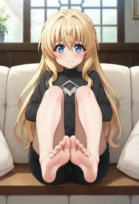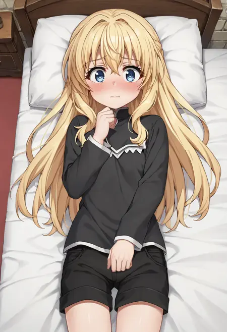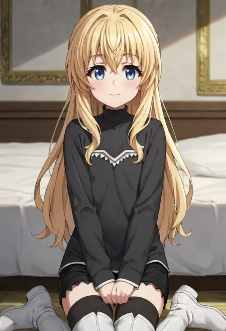 priestess-shirt,priestess \(goblin slayer!\),blue eyes,long hair, blonde hair,black shirt,long sleeves,black shorts,thighhighs,white boots
