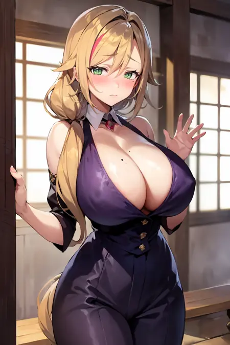 game avatar trigger: naddy-ingame, green eyes, honey blonde hair, streaked hair, multicolored hair, two-tone hair, pink hair, hair behind ear, hair over shoulder, (long hair:1.2), (mole:0.8), huge breasts, mature female, hair between eyes, low ponytail, low-tied long hair