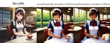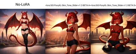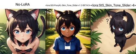 这是一个专为 PonyXL 模型设计的肤色调节滑块。自 v1.2 BETA 起,正数值会产生更深的肤色,负数值则产生更浅的肤色。但由于动漫风格的特性,负数值的效果不如正数值明显,因为大多数动漫角色本身肤色已较浅。