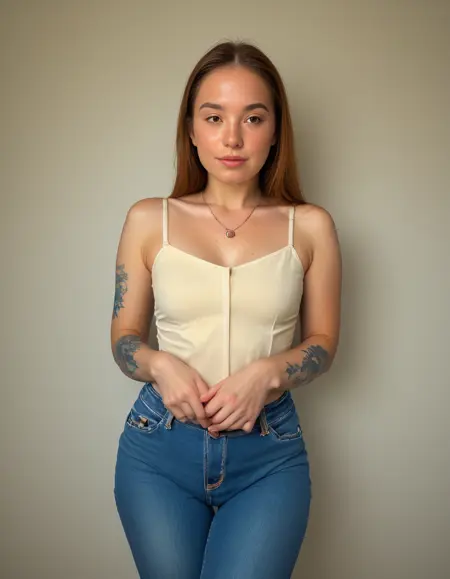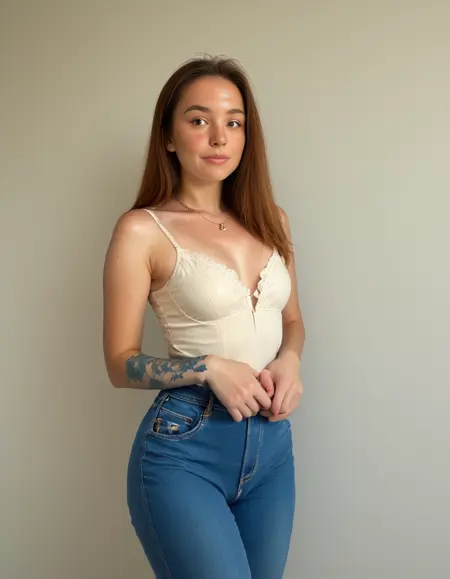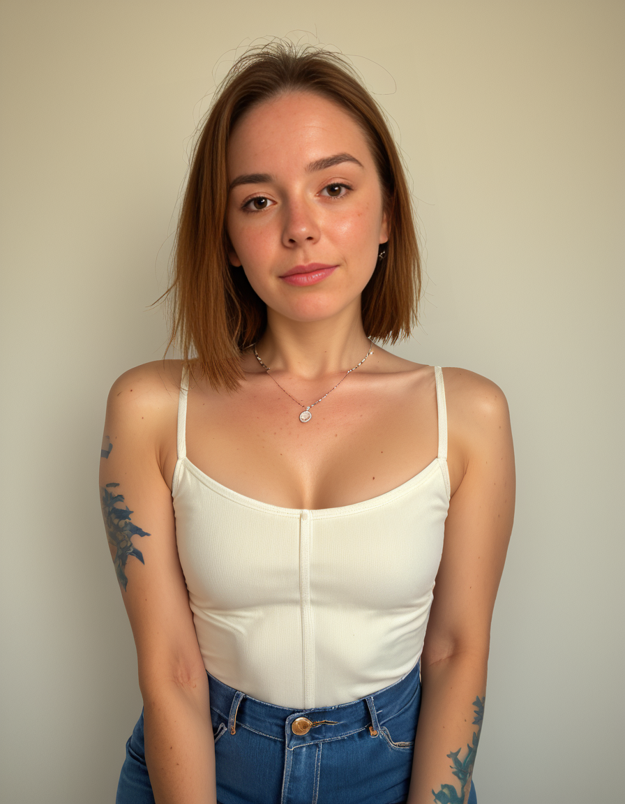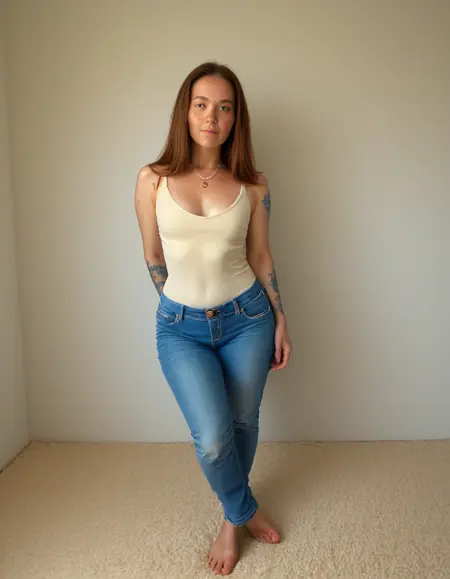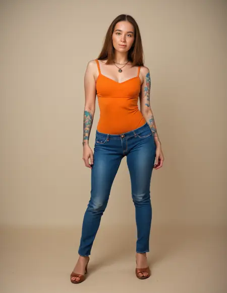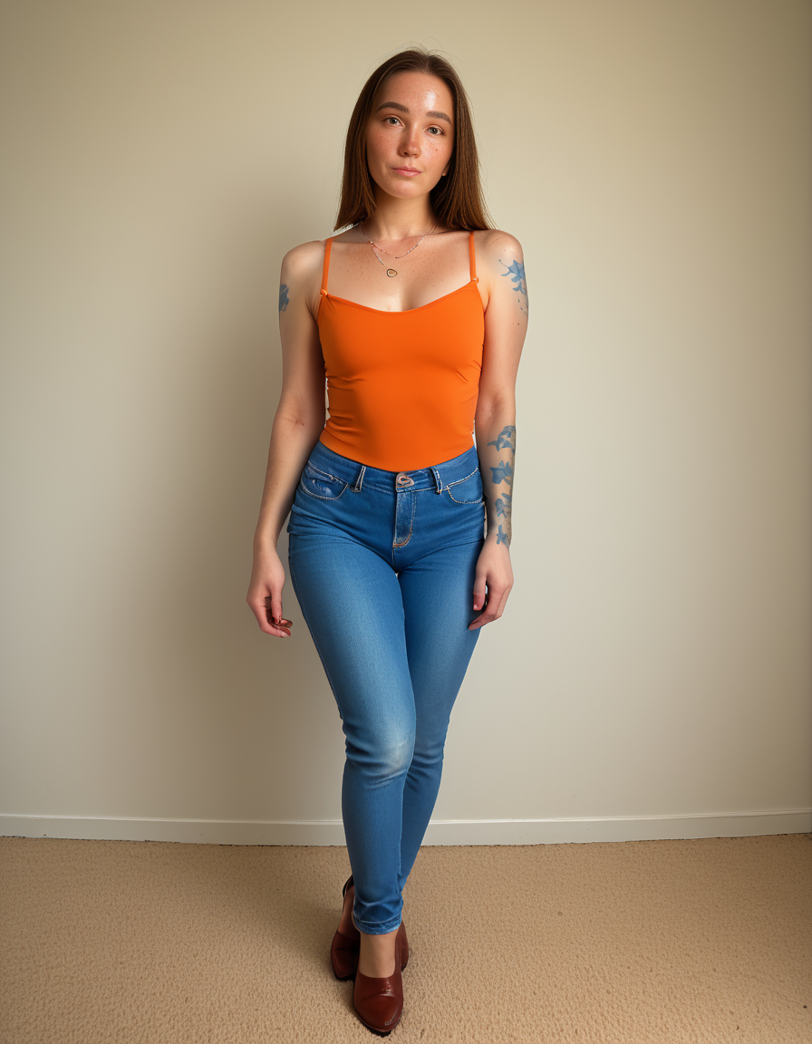 (freckles:1.2),brown eyes,necklace,tattoo,(face freckles:1.2),full body,jeans,
