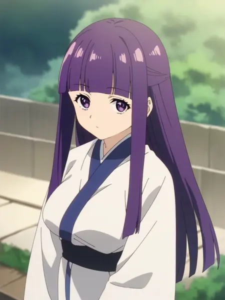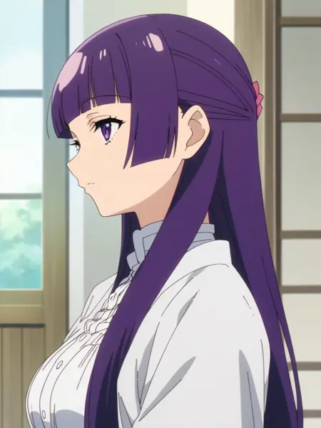 ferbn, long hair, purple hair, blunt bangs, purple eyes, robe,large breasts,