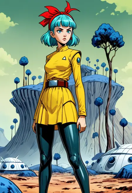 基本的に、これは通常の地球の背景を置き換えます。例をいくつか残しますが、主なタグは:namek, green sky, blue grass です。これで基本的なナメック星の風景を始められます。その後、いくつかの付属要素がありますが、すべてが常に機能するわけではありません。もし私のデータセットにさらに画像を追加できれば、これらも改善できるかもしれません: