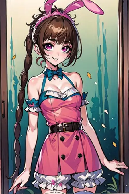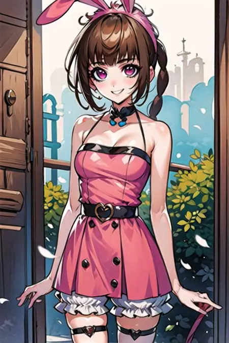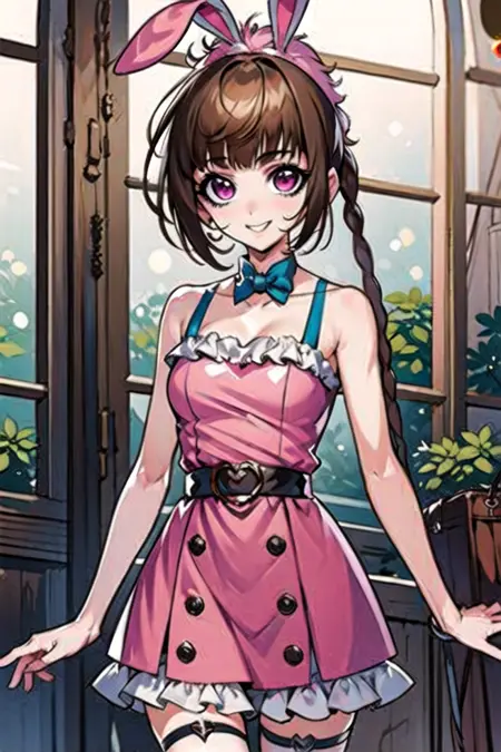 소오우, 자홍색 눈, 갈색 머리카락, 전갈 꼬리 모양의 머리카락, 토끼 귀