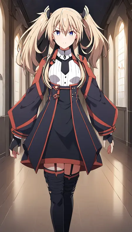 <lora:sasha_necron-maou_gakuin_no_futekigousha_s2-v3-ixl-anime-soralz:1>, sasha necron (maou gakuin no futekigousha), long hair, blonde hair, twintails, hair between eyes, sidelocks, hair ribbon, blue eyes