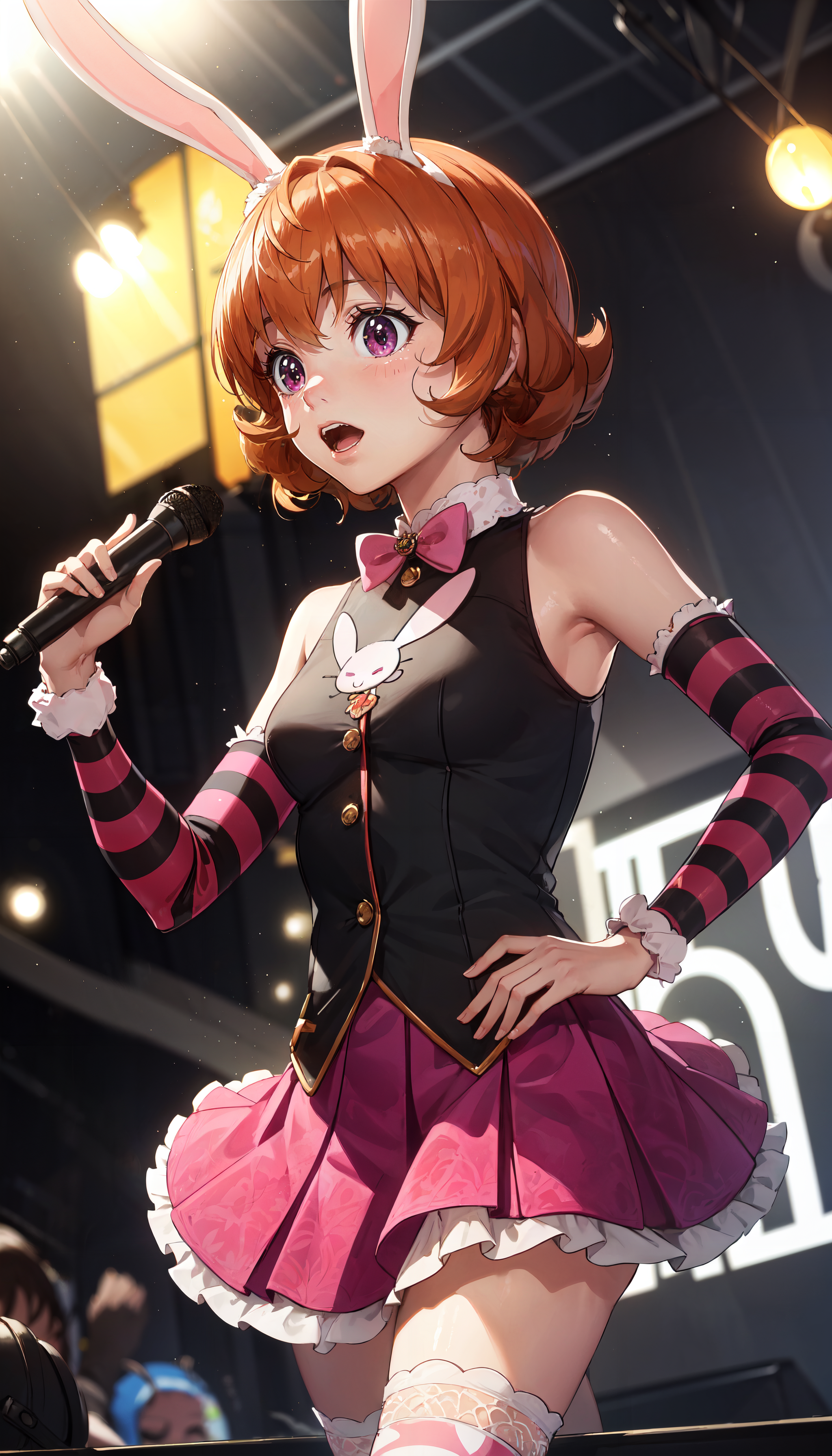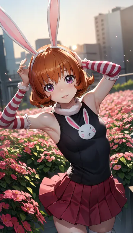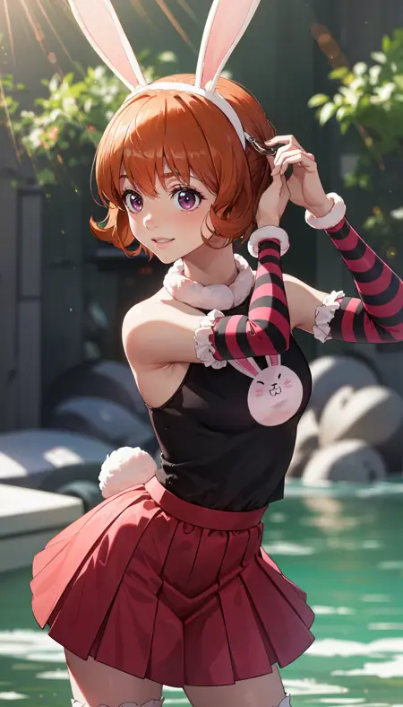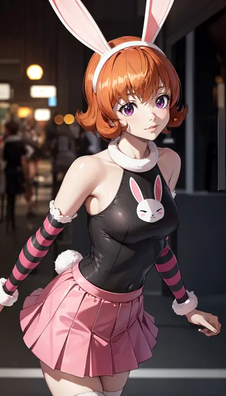 short hair, brown hair, bunny ears, pink eyes, black top, detached sleeves, striped sleeves, bare shoulders, halterneck, pink skirt, pleated skirt