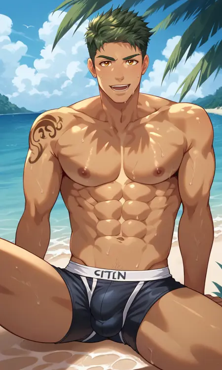 팔 문신, 갈색 셔츠, 벌어진 옷, 녹색 목 스카프, 귀 고리, 녹색 반바지, 소매 말아 올리기, 목에 휘슬, 검은 벨트, 흰색 브리프