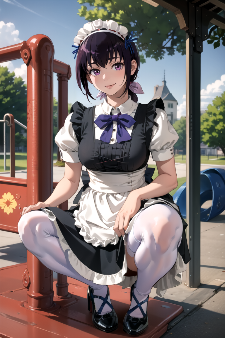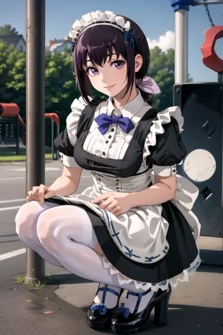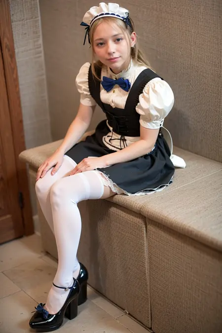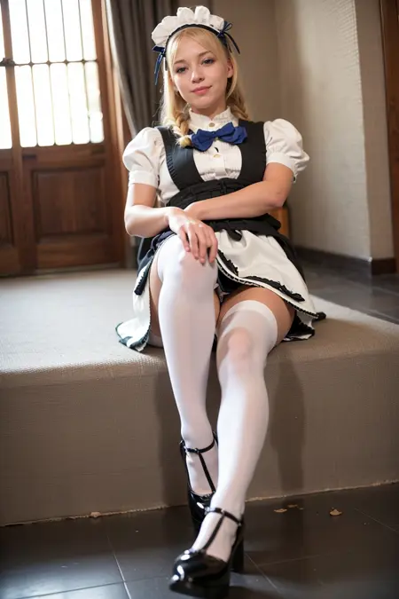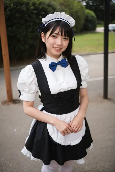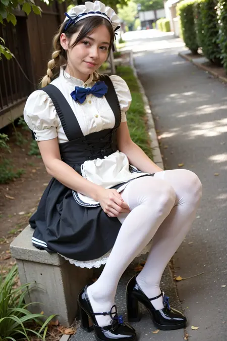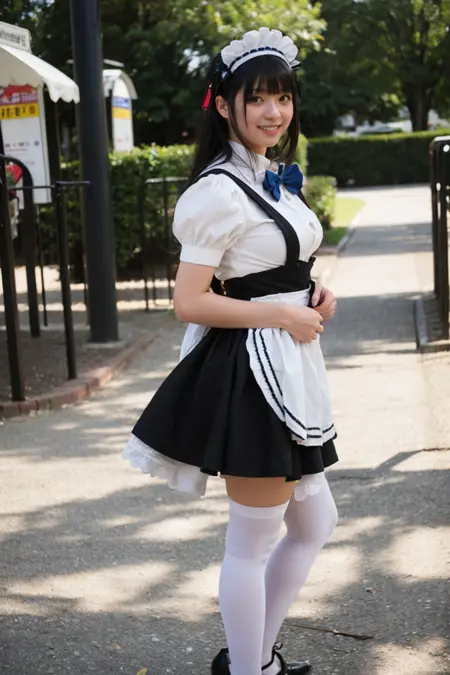 (부풀어 오른 소매, 검은 신발, 앞치마, 검은 드레스, 하이힐, 흰색 허벅지 스타킹, 부풀어 오른 짧은 소매, 메이드, 메이드 헤드기어, 파란색 리본, 파란색 넥타이)