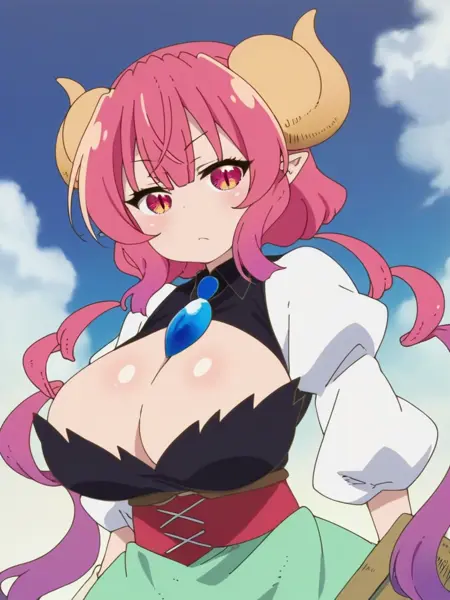 이루루, 드래곤 소녀, 긴 머리, 분홍 머리, 드래곤 뿔, 뾰족한 귀, 다채로운 머리카락, 붉은 머리, 앞머리, 수직 동공