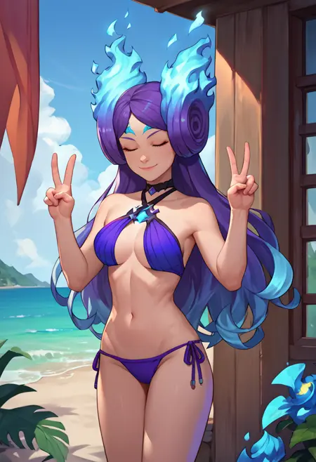 Default Outfit: brighiddef, fiery hair, blue fire, purple dress, center opening, belt, blue gloves, elbow gloves, blue thighhighs, bare shoulders, cleavage