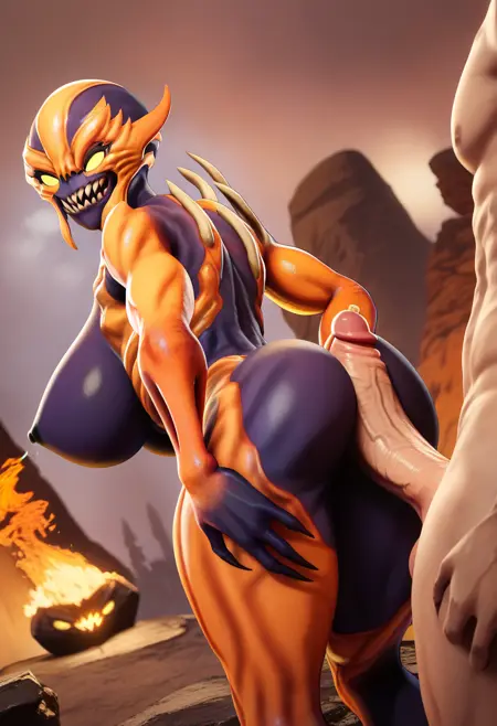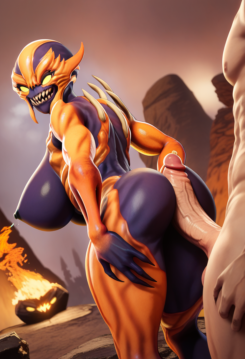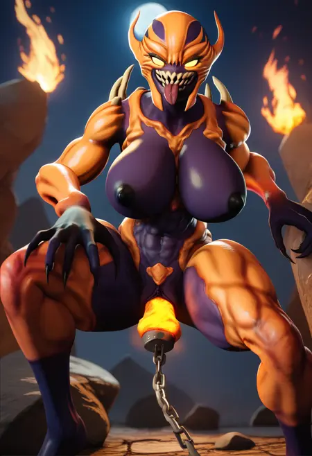 sharp teeth, large breasts, demon girl, female, demon, imp, curvy, horns, purple skin, orange skin, colored skin, muscular, monster girl, glowing eyes, tongue, muscular female, multicolored skin, no pupils, glowing, fingernails, yellow eyes, sharp fingernails