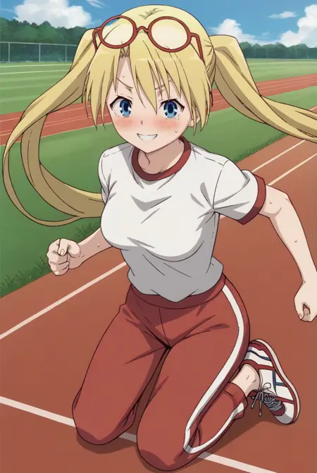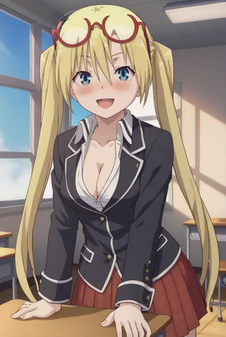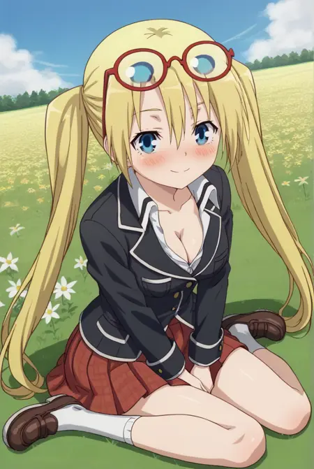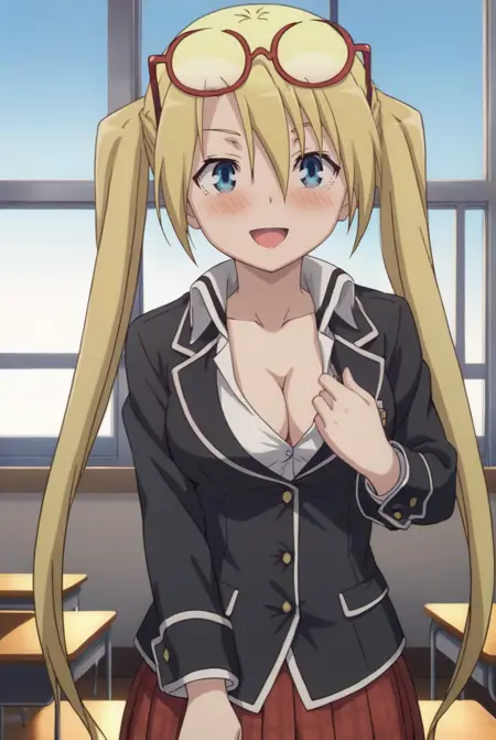 默认服装:["selina sherlock, blue eyes, blonde hair, twintails, long hair, glasses, eyewear on head, school uniform, white shirt, black jacket, plaid skirt"]