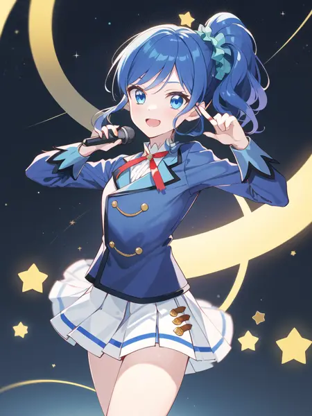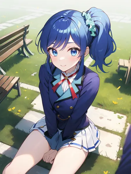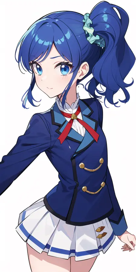 ・미니스커트, 흰 치마, 허벅지, 파란 재킷, 파란 눈, 빨간 넥리본, 파란 머리, 파란 눈, 파란 머리, 사이드 페니테일,