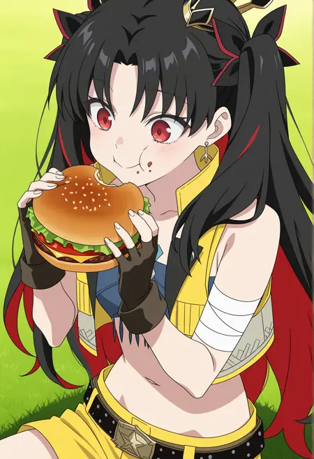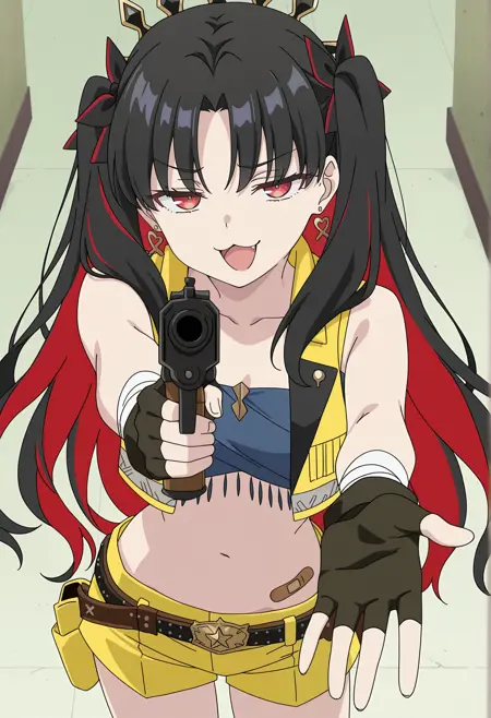 Asc2:長い髪、多色の髪、ツインテール、二色髪、黒髪、赤髪、髪のリボン、両サイドアップ、王冠、赤目、イヤリング、絆創膏、黄色いベスト、黄色いショートパンツ、指なし手袋、ベルト、ジュエリー、包帯、ブーツ