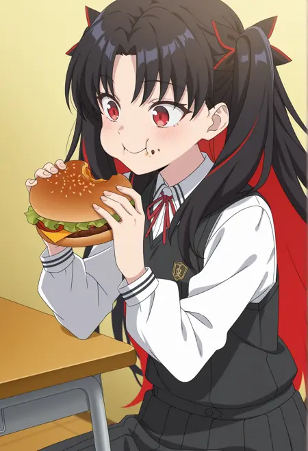 学校制服:長い髪、多色の髪、ツインテール、二色髪、黒髪、赤髪、髪のリボン、両サイドアップ、赤目、学校制服、黒いベスト、黒いスカート、赤いリボン