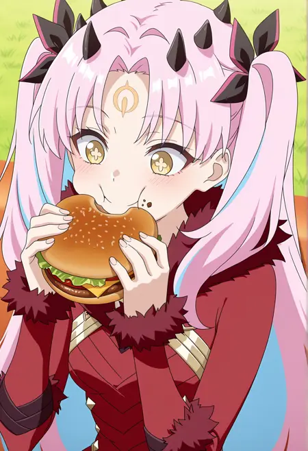 Asc3:長い髪、多色の髪、ツインテール、二色髪、ピンク髪、青髪、髪のリボン、両サイドアップ、黄目、シンボル形の瞳孔、角、三日月形の顔の模様、額の模様、顔の模様、赤いボディスーツ、ファーのトリム、ファーのトリム付きマント
