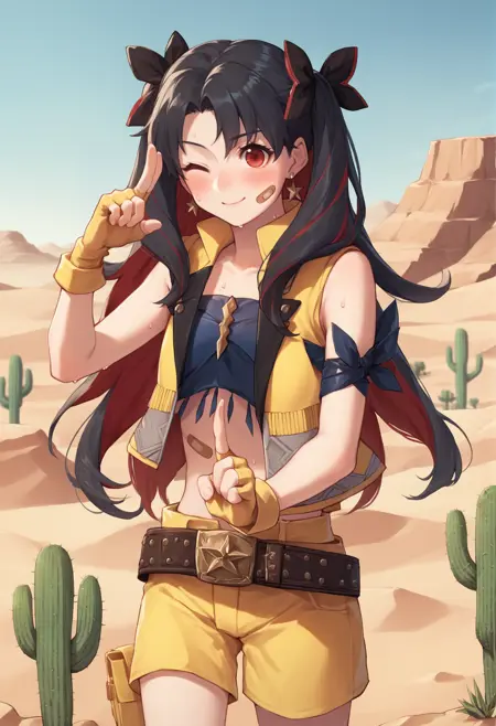 Asc2: 긴 머리, 다색 머리, 듀얼 테일, 이톤 헤어, 검은 머리, 빨간 머리, 머리 리본, 양측 올리기, 왕관, 빨간 눈, 귀걸이, 반창고, 노란 조끼, 노란 반바지, 손가락 없는 장갑, 벨트, 보석, 붕대, 부츠