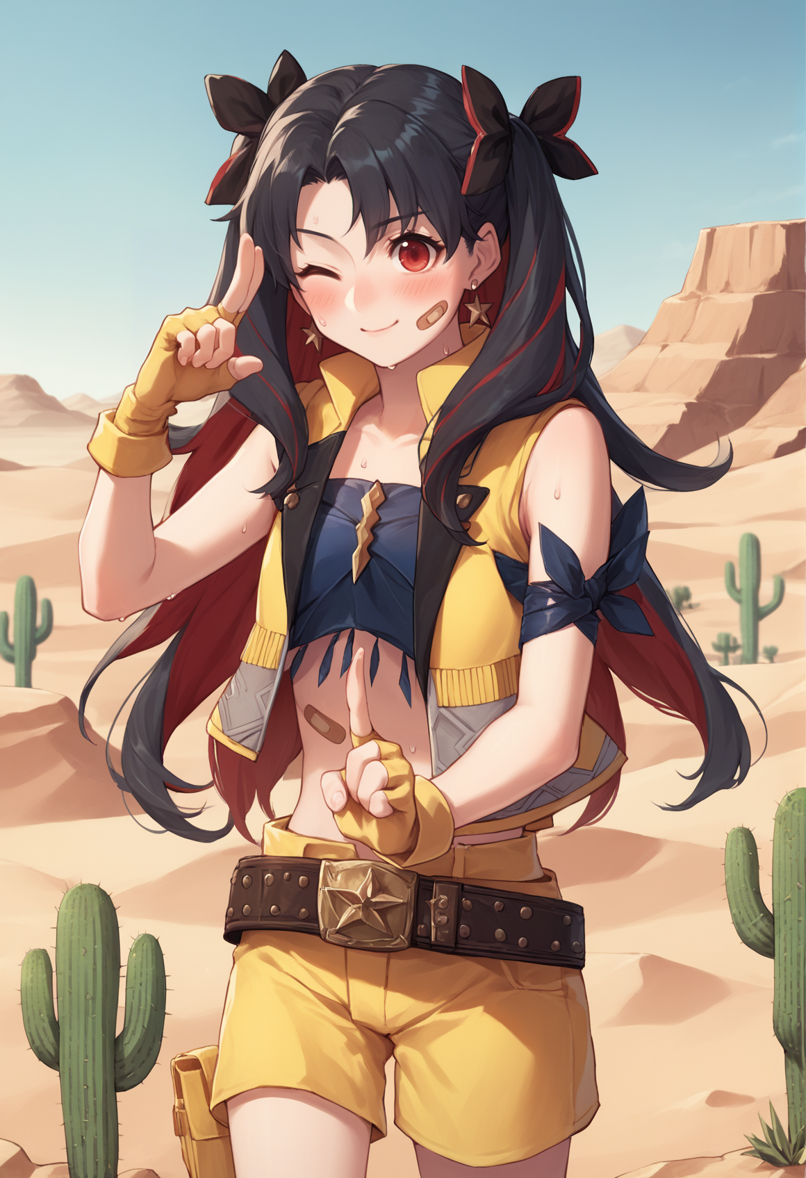 Asc2: long hair, multicolored hair, twintails, two-tone hair, black hair, red hair, hair bow, two side up, crown, red eyes, earrings, bandaid, yellow vest, yellow shorts, fingerless gloves, belt, jewelry, bandages, boots