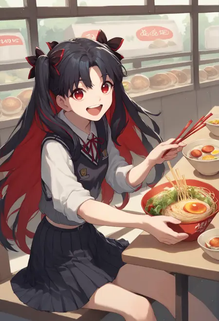학교 복장: 긴 머리, 다색 머리, 듀얼 테일, 이톤 헤어, 검은 머리, 빨간 머리, 머리 리본, 양측 올리기, 빨간 눈, 학교 복장, 검은 조끼, 검은 치마, 빨간 리본