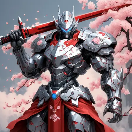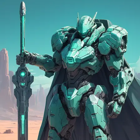 提示词:"score_9, score_8_up, score_7_up, score_6_up, score_5_up, score_4_up, (sci-fi, 1girl, wearing mecha armor, smirking, grin, beautiful hair, looking at viwer, blue eyes, holding a glowing sword, unreal engine 5:1.2), sci-fi background, hkmecha"