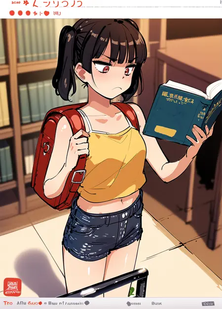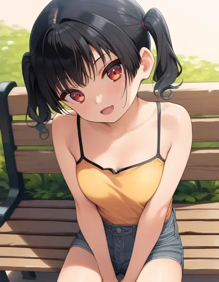 트리거 단어: sasaki kanna \(kaedeko\), 짧은 트윈테일, 노랑 커프스 상의, 스파게티 스트랩, 데님 반바지