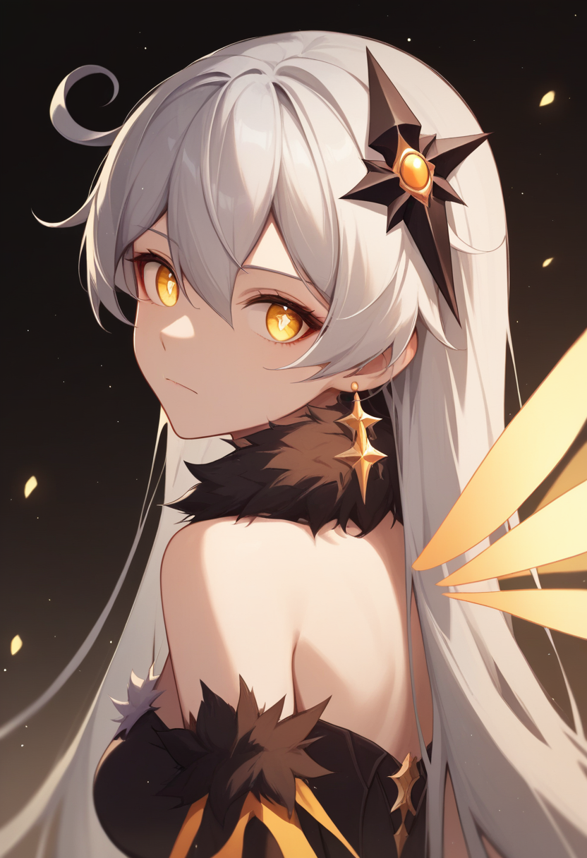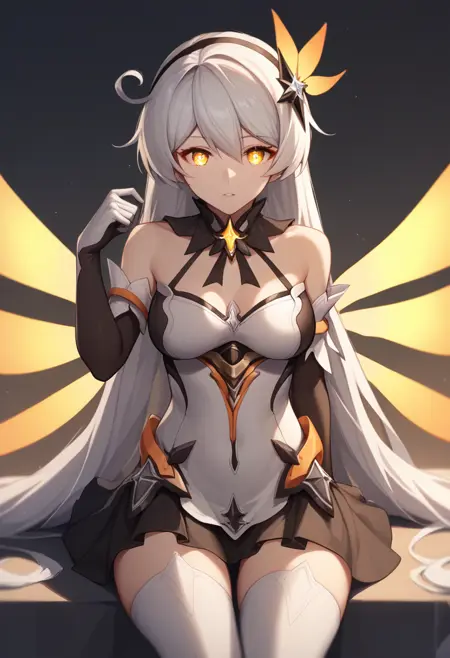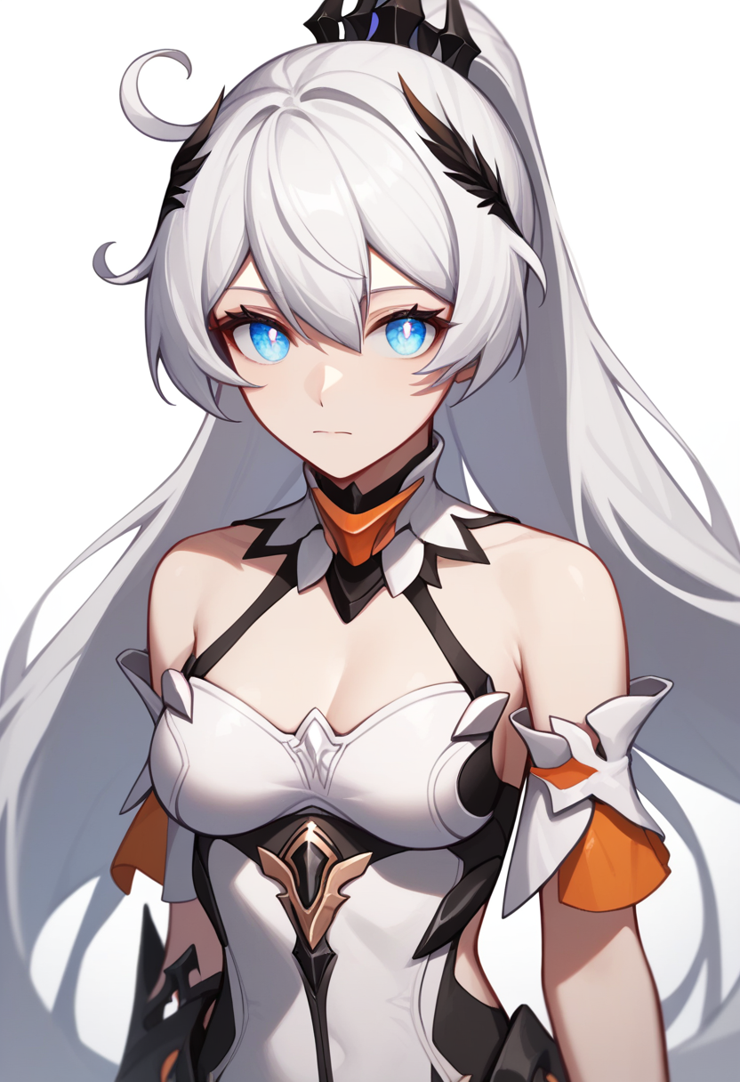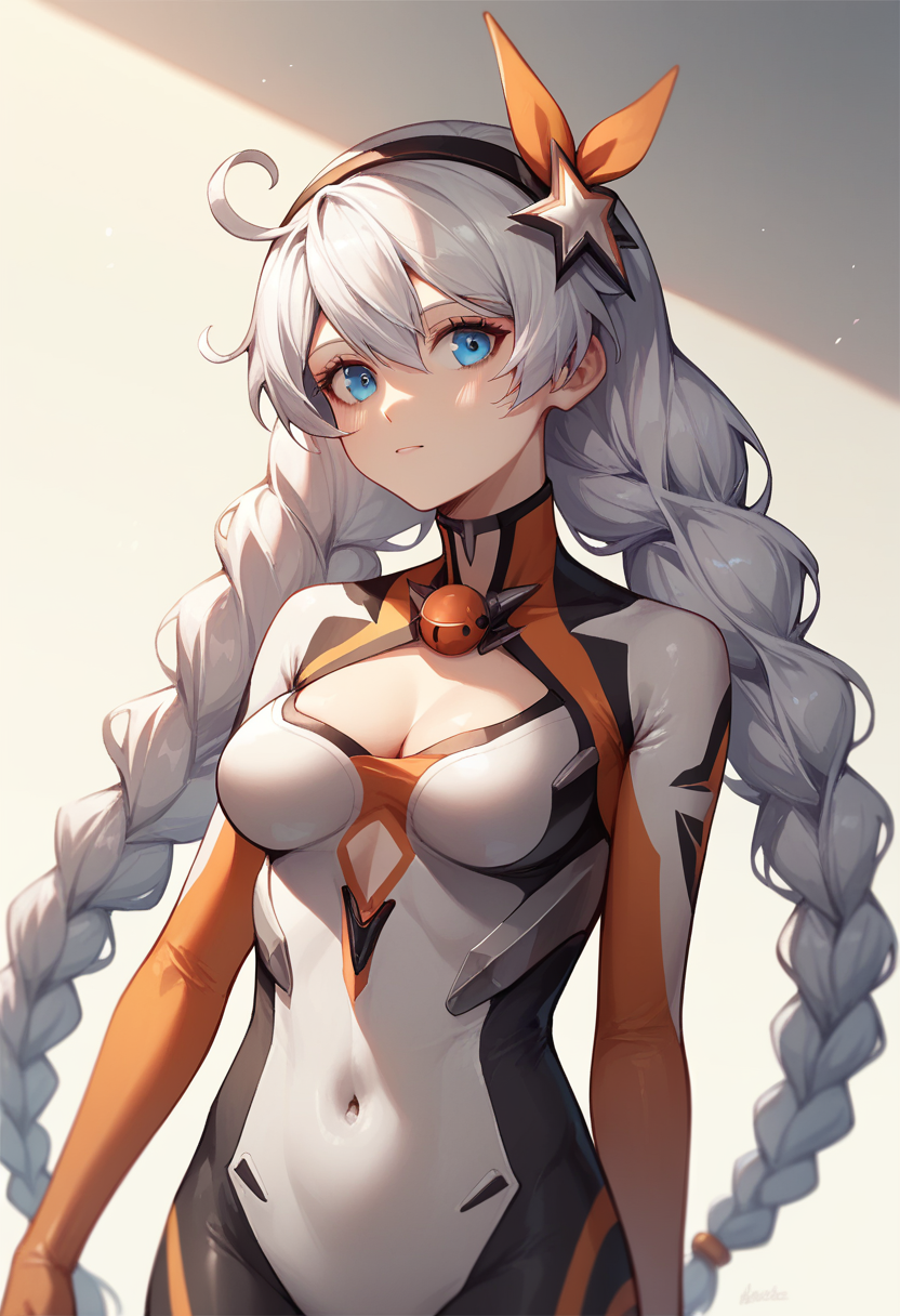 kiana_kaslana_(white_comet),silver hair,very long hair,twin braids,ahoge,bangs,blue eyes,medium breasts,bodysuit,hairband,cleavage cutout,hair ornament,