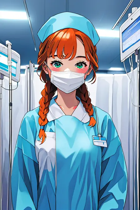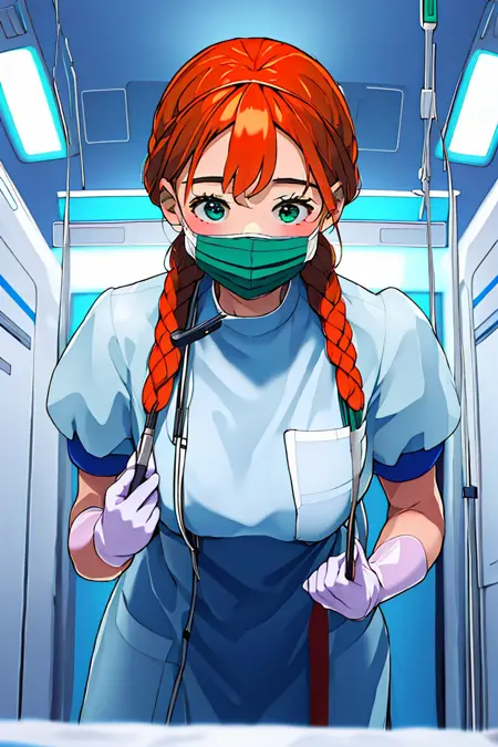 fumiko miyashita, 3dcg_21,orange_hair,green_eyes,twin_braids,hair_on_shoulders,