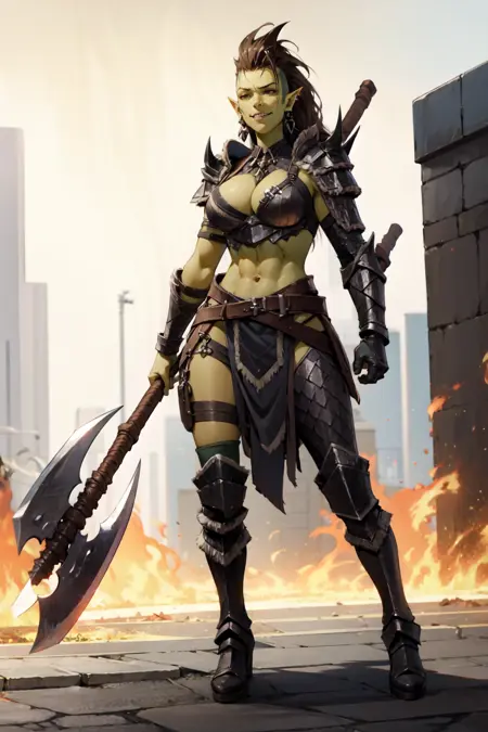 耳环, 绿色皮肤, 大乳房, 长发, 兽人, 尖耳朵, 棕色头发, 莫霍克发型, 灰色眼睛, 面部纹身, 面部彩绘, 圆环耳环, 剃发造型, 纹身, 面部标记, 身体彩绘,x服装
