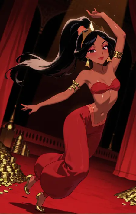 | 训练词汇 | slave jasmine, 1girl, solo, dark-skinned female, brown eyes, black hair已复制! lipstick, makeup, jewelry, golden triangular earrings, high ponytail with hair band, bare right bicep, red bandeau bra, arabian clothes, long hair, golden snake armlet, red harem pants, golden pointy footwear已复制! wrist shackles, cuffs, chain已复制! |
