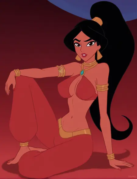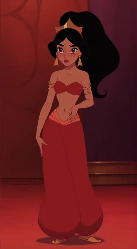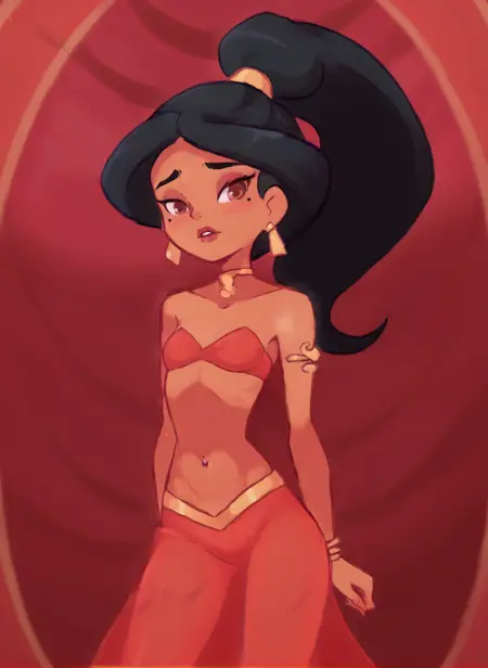 lipstick, triangular gold earrings, high ponytail hair with band, pointy footwear, golden footwear, long hair, golden snake armlet on left bicep, red bandeau bikini top, red harem pants, red clothes, Arabian clothes