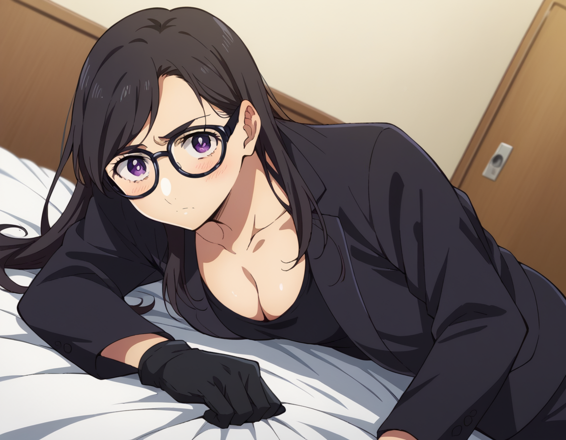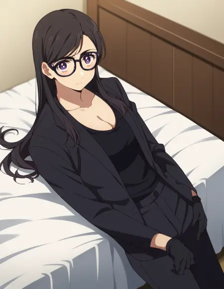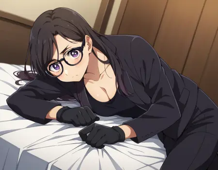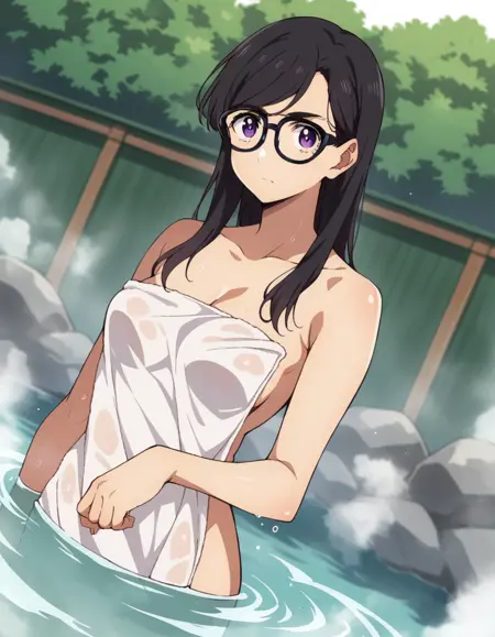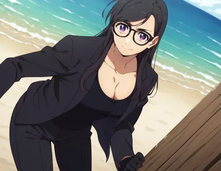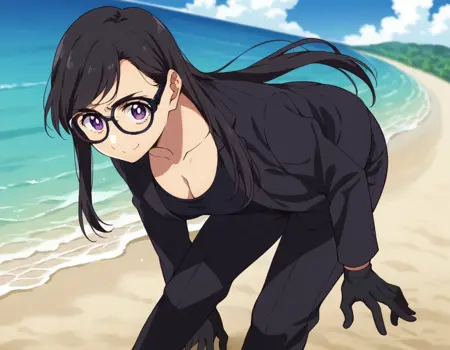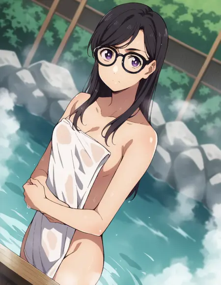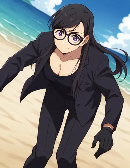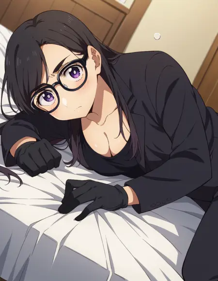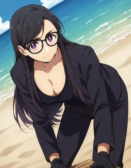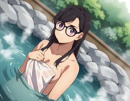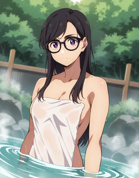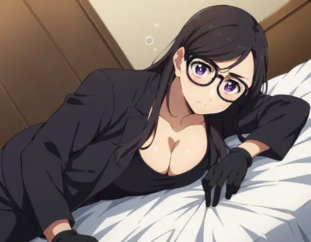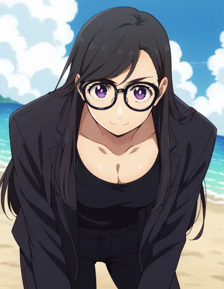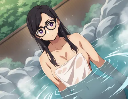 hizuru minakata, 長い髪, 黒髪, 眼鏡, 紫色の目, 黒枠の眼鏡,