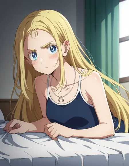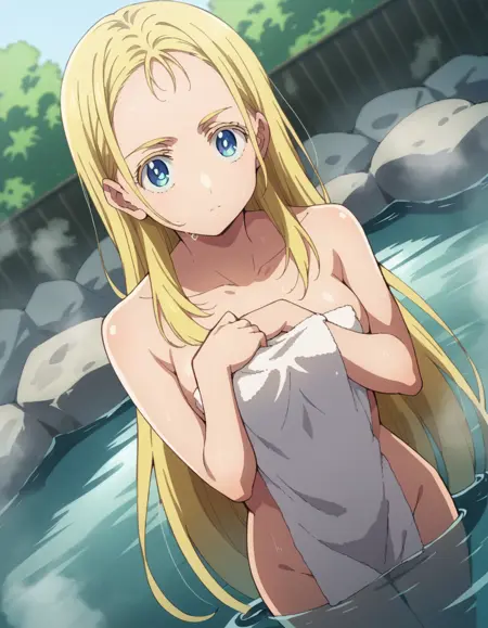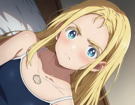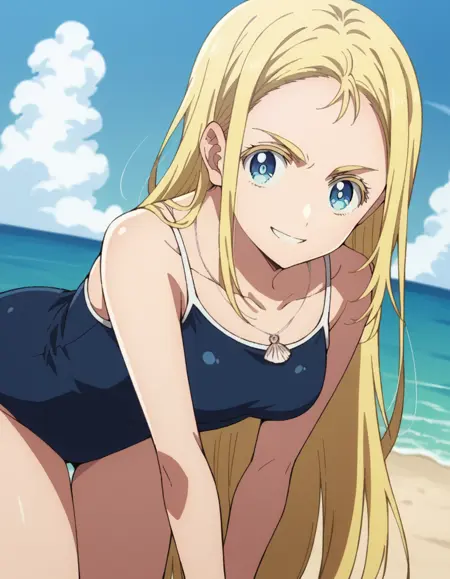 ushio kofune, long hair, blue eyes, blonde hair, very long hair, straight hair, forehead,
