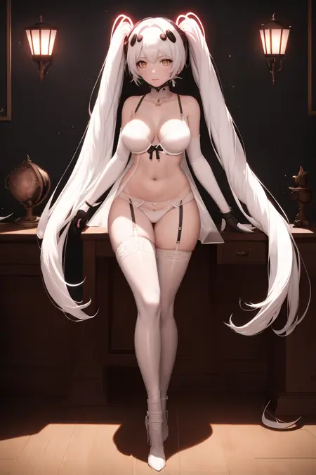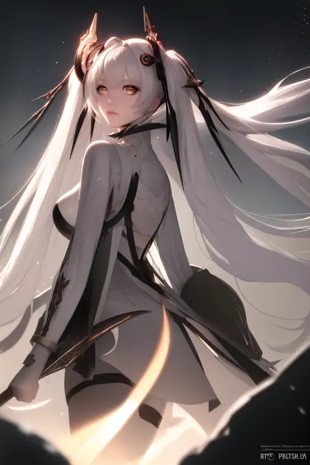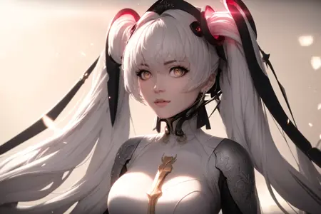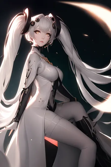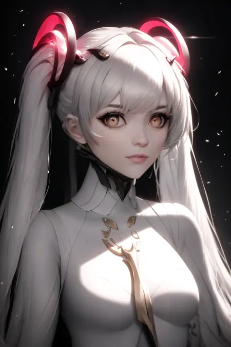 <lora:pgr_luna:0.7>, pgr_luna, 8k, intricate, elegant, highly detailed, majestic, hires, masterpiece, best quality, 1girl, bangs, breasts, eyebrows_visible_through_hair, hair_ornament, light_particles, long_hair, looking_at_viewer, medium_breasts, solo, twintails, very_long_hair, yellow_eyes, white hair,ネガティブプロンプト: