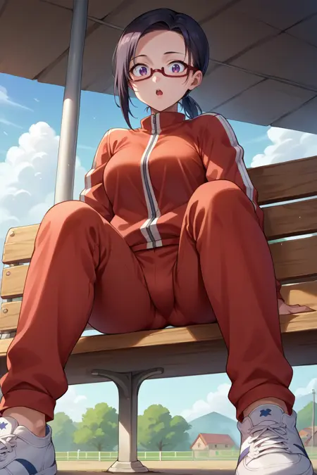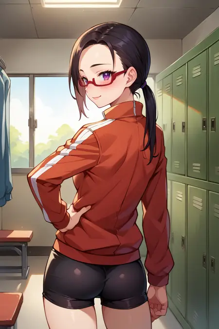 为她的典型外观添加 "眼镜、红色运动夹克、拉链夹克、红色长裤"。