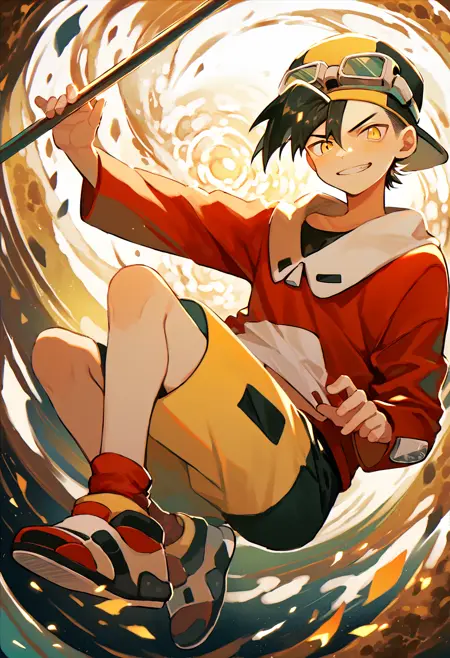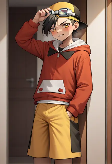 클래식/모험 룩 gold_sp: 검은 머리, 노란 눈, 검은색 줄무늬가 있는 노란색 모자 (뒤집어 쓴 모자), 머리에 안경 착용, 빨간 재킷, 노란색에 검은색 반바지, 빨간 양말, 스니커즈