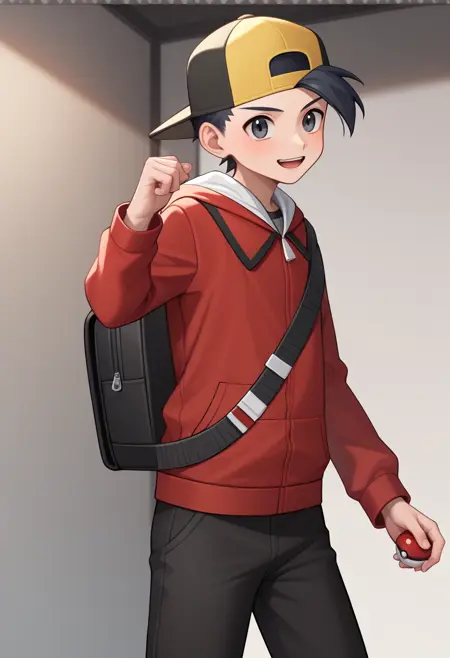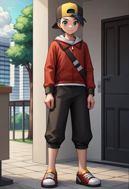 HeartGold 룩: 이단, 검은 머리, 회색 눈, 노란색 줄무늬가 있는 검은색 야구모자 (뒤집어 쓴 모자), 빨간 후디, 흰색 셔츠, 검은색 카프리 바지, 빨간색 흰색 운동화