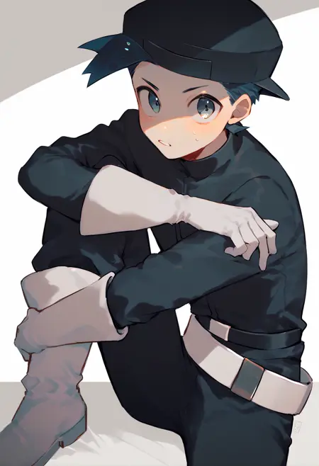 로켓 복장: ethan_rt, 검은 머리, 회색 눈, 검은 모자, 검은 재킷, 검은 바지, 흰 장갑, 흰 부츠, 벨트