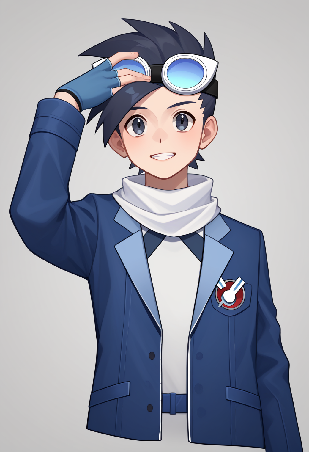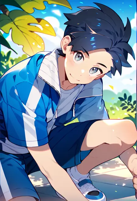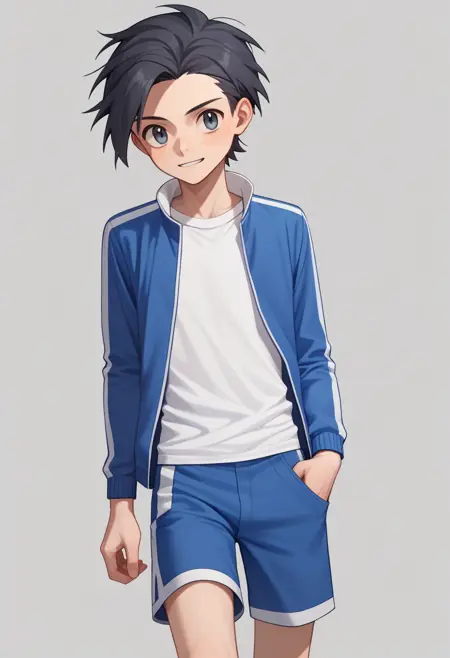 포케아슬론 복장: ethan_pk, 검은 머리, 회색 눈, 파란 재킷, 흰 셔츠, 파란 반바지, 흰색이 있는 파란색 스니커즈
