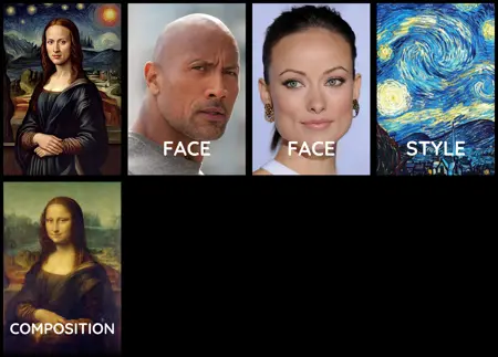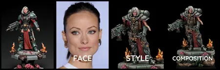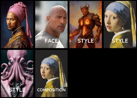 InstantID+스타일+구성. 또는 스타일/구성을 사용하지 않고 InstantID만 사용하고, 포함된 원 클릭 프롬프트를 활용해 새로운 아이디어를 만들어보세요. 여러 얼굴을 결합하여 당신만의 최종 얼굴을 설계하세요.