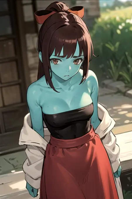 AnakZahardOri, 1girl, solo, long hair, brown hair, bare shoulders, collarbone, hair ribbon, ponytail, hair bow, strapless, colored skin, green skin, cleavage, brown eyes, medium breasts, long skirt,