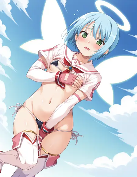 通常の衣装: angel, halo, sailor collar, shrug \(衣装\), pink crop top, cross, necktie, brooch, fingerless gloves, elbow gloves, gem, short sleeves, swimsuit under clothes, white one-piece swimsuit, thighlet, thigh strap, thigh boots, glowing wings