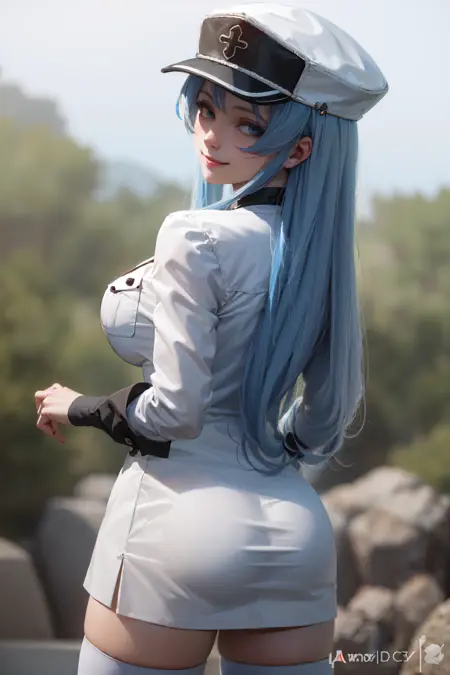 에스데스, 긴 파란 머리카락, 흰색 뾰족 모자, 파란 눈, 하얀 군복, 흰색 무릎 양말, 흰색 신발, 허벅지 부츠, 목줄, 절개선, 커다란 가슴마인의 트리거 + 외모 + 복장: