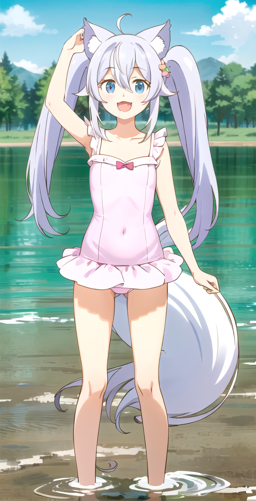 Swimsuit-'frill swimsuit, one-piece swimsuit, flower hair ornament, twintails,' *goofed on the tagging, otherwise only 'frill swimsuit' would have been needed*