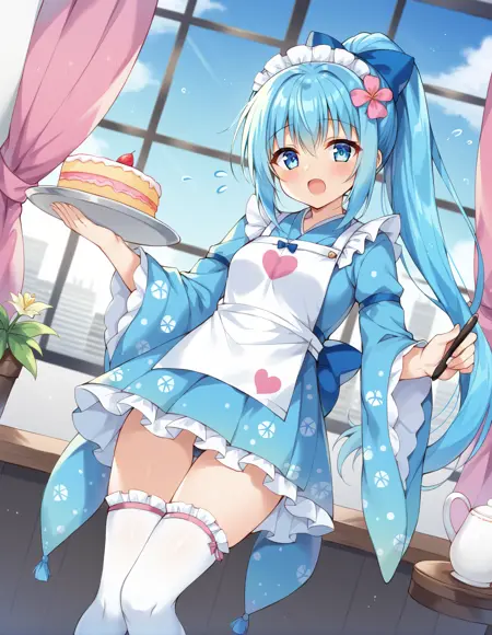 기모노 복장: 흰색 머리장식, 프린트 기모노, 파란 기모노, 넓은 소매, 긴 소매, 하트 프린트, 흰색 앞치마, 프릴 스커트, 리본 장식, 프릴 허벅지양말, 파란 신발