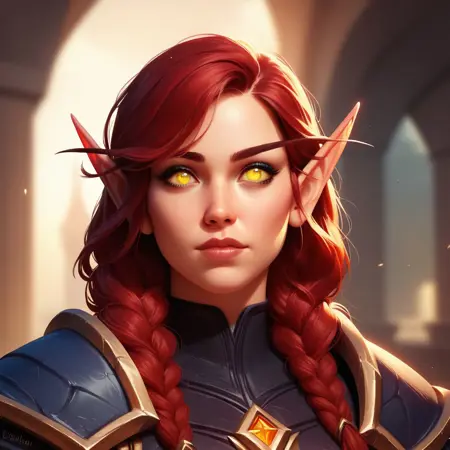 例:エルフ、尖った耳、長い眉、1girl、緑の目、赤い髪、鎧、
