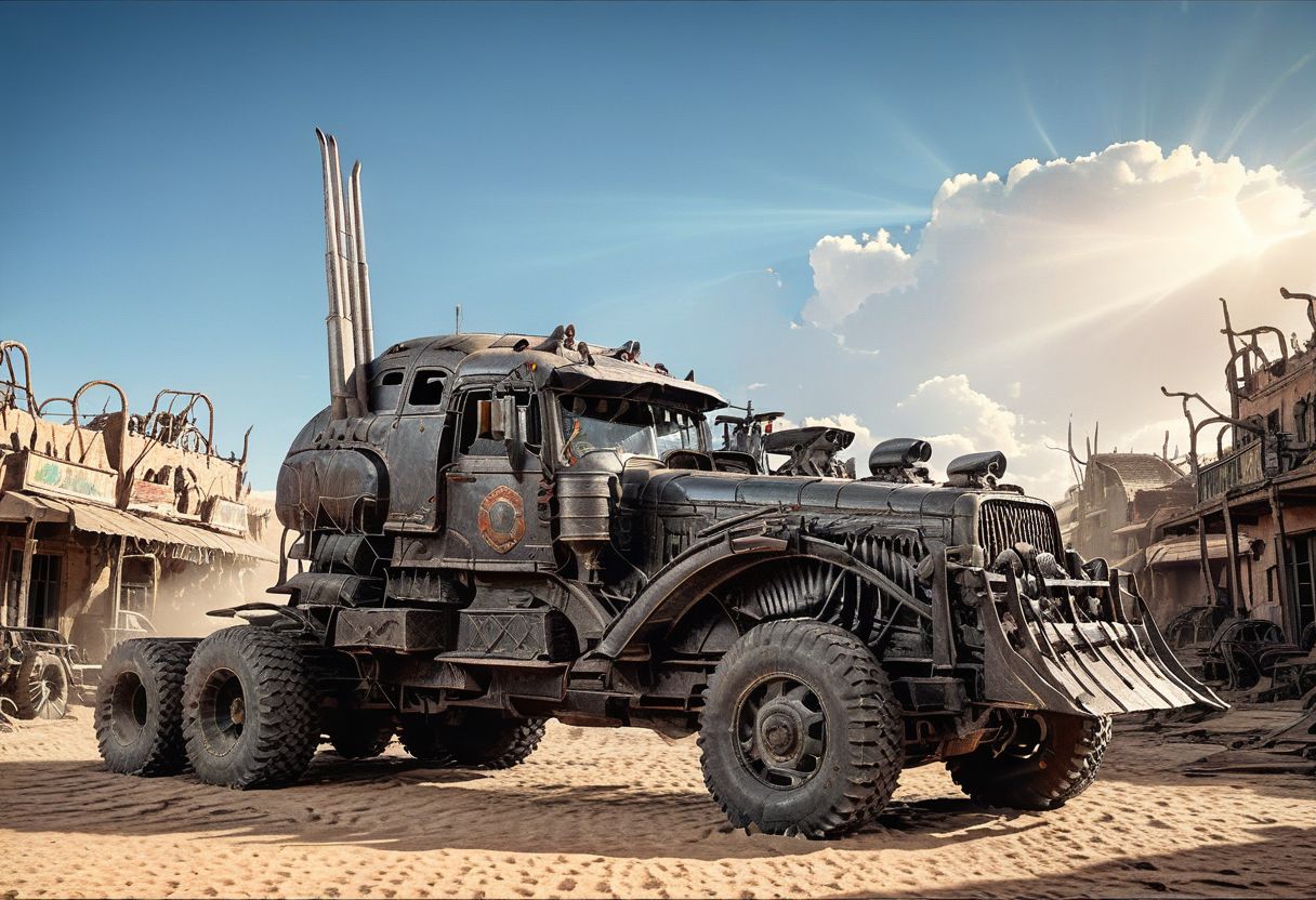 war rig, rat rod truck, exhaust pipes, wheels, motor vehicle, ground vehicle, vehicle focus, driving in desert, daytime, sunlight, 2.5d, back view, high contrast, highly detailed, award-winning photo, realistic, high contrast, volumetric lighting, global illumination, Cinematic, Cinematic Shot, Cinematic Lighting,